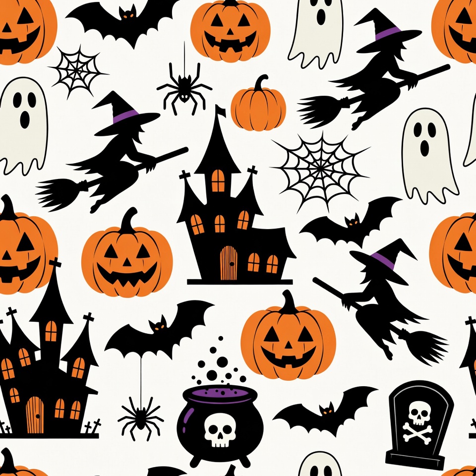October, bat, black witch, broom, cartoon, castle, cauldron, clipart, flying bat, ghost, gravestone, haunted house, holiday, illustration, isolated background, jack-o-lantern, orange pumpkin, pattern, pumpkin, seamless, spider, spooky, web, white ghost, witch, Halloween