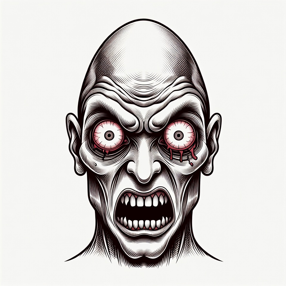 angry face, bald head, blood drip, bloodshot eyes, engraving, fierce expression, grimace, horror, illustration, isolated background, line art, male, man, open mouth, portrait, red eyes, scary, sharp teeth, undead, white background, zombie