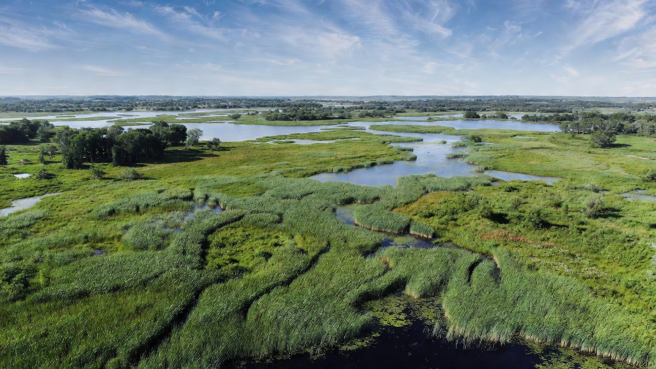 aerial view, aquatic plants, blue sky, bog, cloudy sky, drone photo, ecosystem, environment, floodplain, grassland, green grass, lagoon, landscape, lush vegetation, marsh, nature, outdoor, panorama, reeds, river channels, scenery, swamp, trees, vegetation, water, waterways, wilderness, wetland