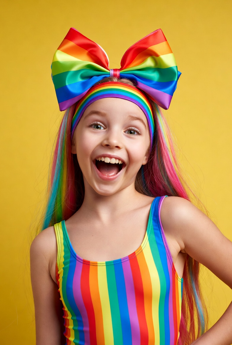 A young girl with long rainbow-colored hair smiles happily against a bright yellow background. She wears a large rainbow bow headband and a rainbow-striped tank top. Her wide eyes and big smile convey joy.