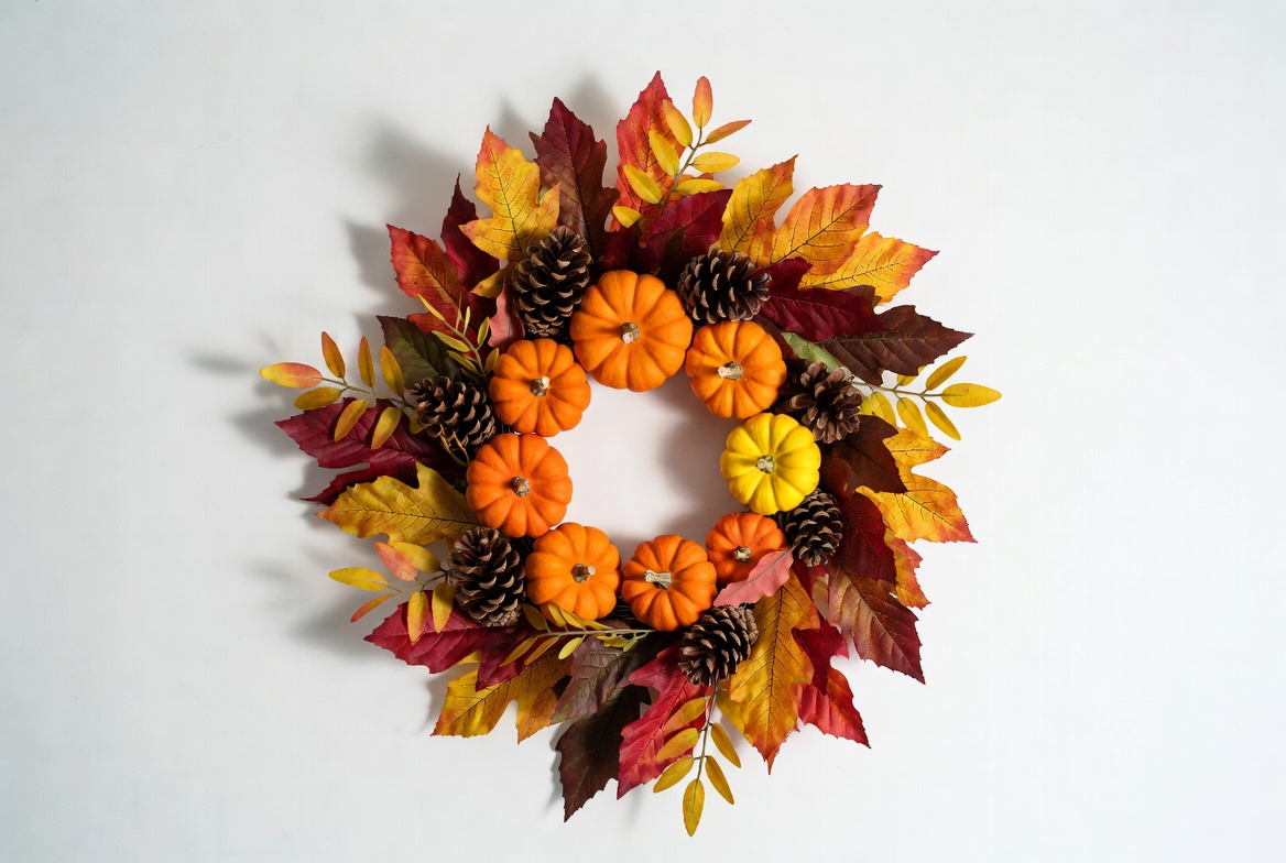 circular wreath, fall decor, fall leaves, foliage wreath, halloween decor, harvest wreath, isolated background, leaf wreath, orange leaves, orange pumpkins, pinecones, pumpkin wreath, red leaves, seasonal decoration, small pumpkins, thanksgiving wreath, white background, yellow leaves, yellow pumpkin, autumn wreath