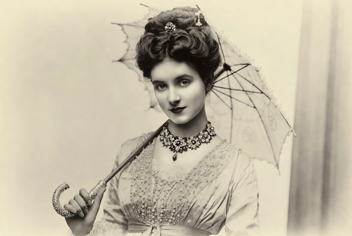 A young woman in a vintage sepia-toned photograph stands holding an open lace parasol over her shoulder. She wears an elaborate Edwardian gown with lace details and a beaded necklace. Her hair is styled in an ornate updo, and she gazes directly at the viewer.