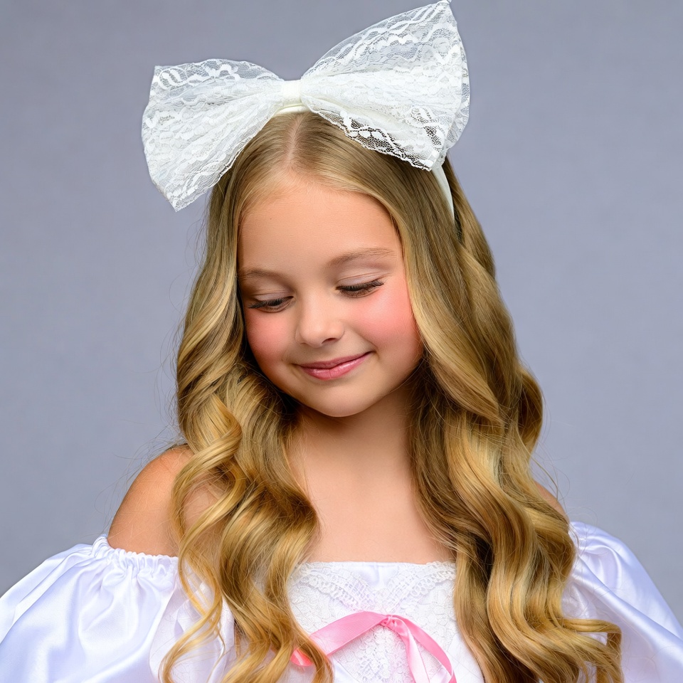 A young blonde girl with long wavy hair wears a large white lace bow headband and an off-shoulder white dress with pink trim. She smiles shyly with eyes closed against a plain gray background. Her fair skin and delicate features are highlighted in the close-up portrait.