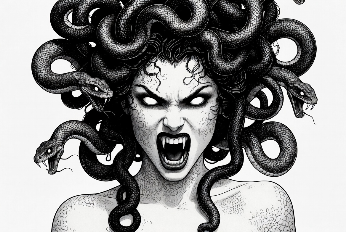 Greek mythology, White, black and white, detailed, eyes, fangs, fantasy, female, fierce, hair, horror, illustration, isolated background, monster, mythical creature, portrait, realistic art, roaring, serpents, snakes, snarling, tattoo style, woman, Medusa