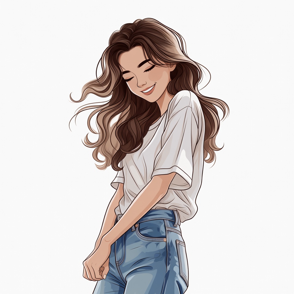 Asian, anime girl, blue jeans, brown hair, casual outfit, digital art, eyes closed, fashion, female, happy expression, head tilt, illustration, isolated background, long hair, portrait, pretty girl, relaxed pose, smiling, stylish, wavy hair, white t-shirt, young woman, woman