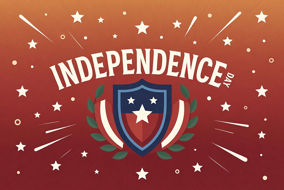 A vibrant illustration features 'INDEPENDENCE DAY' text in bold white letters above a blue shield with white stars and red stripes, framed by green laurel branches. Golden fireworks and stars burst across an orange-red gradient background. The design celebrates the Fourth of July in a patriotic style.