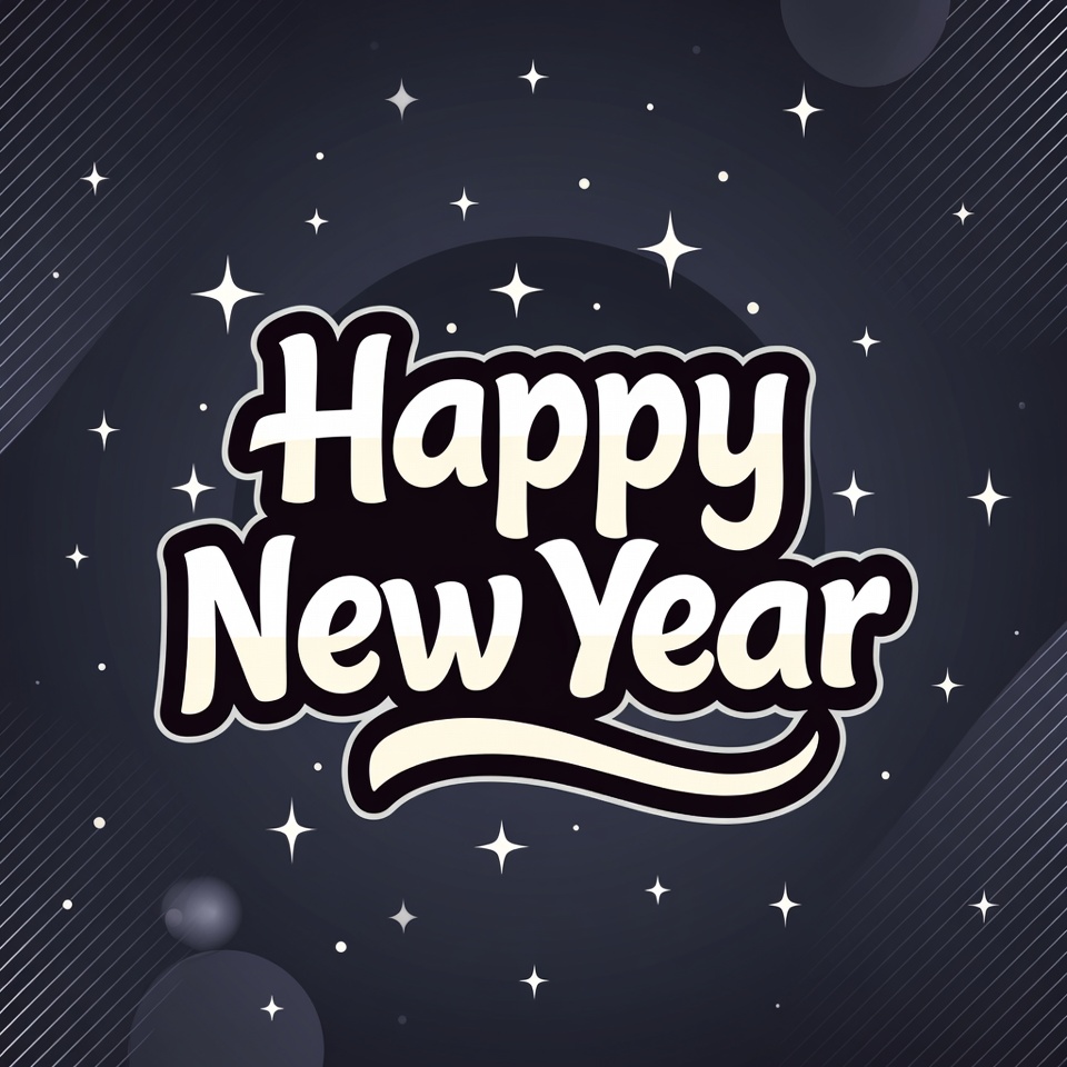 A vibrant digital illustration features the text 'Happy New Year' in bold white cursive font on a dark navy background. Sparkling stars and glowing planets surround the festive greeting. Diagonal white stripes and subtle sparkles enhance the celebratory design.