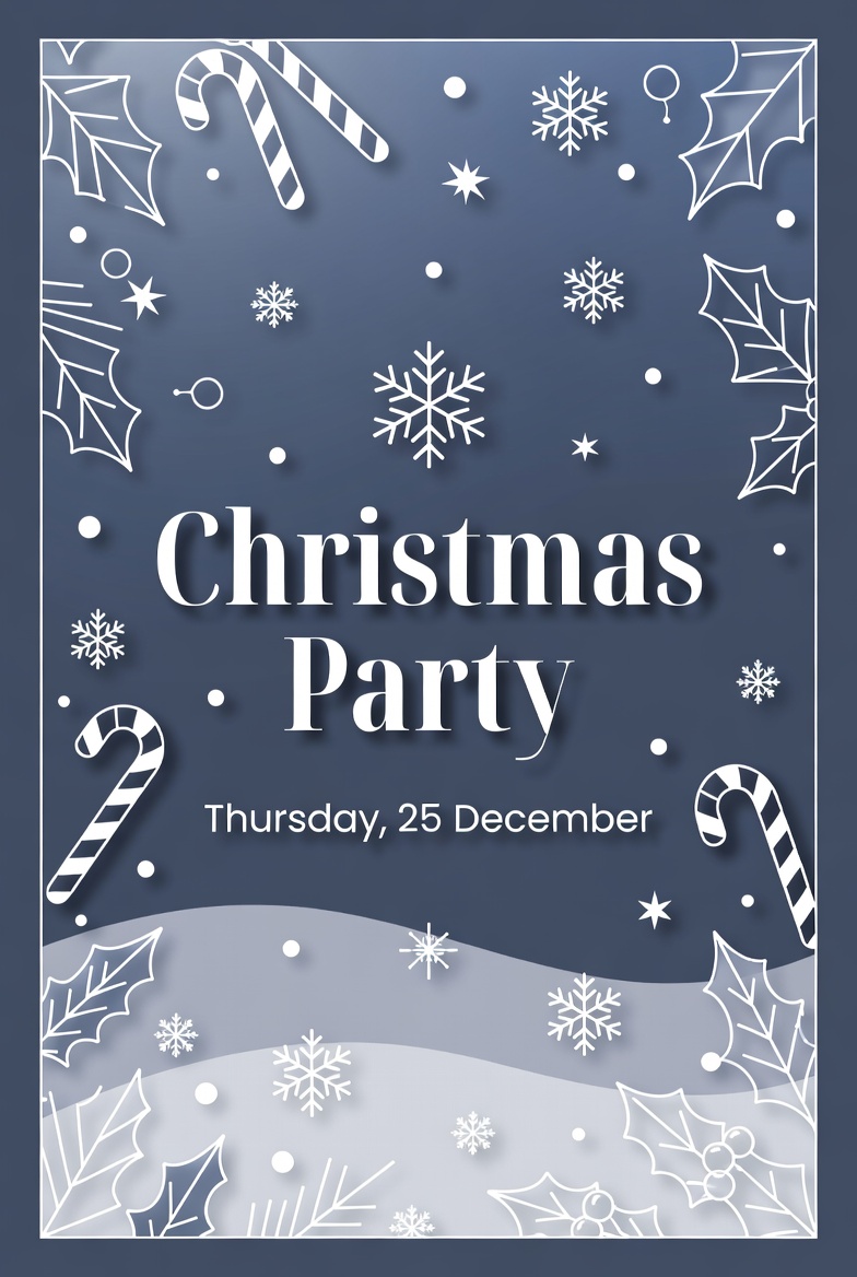 A festive Christmas party invitation poster features bold white text reading 'Christmas Party' and 'Thursday, 25 December' on a navy blue background. It is decorated with white outline illustrations of candy canes, holly leaves, snowflakes, and stars. The design has a snowy wave pattern at the bottom and a white frame border.