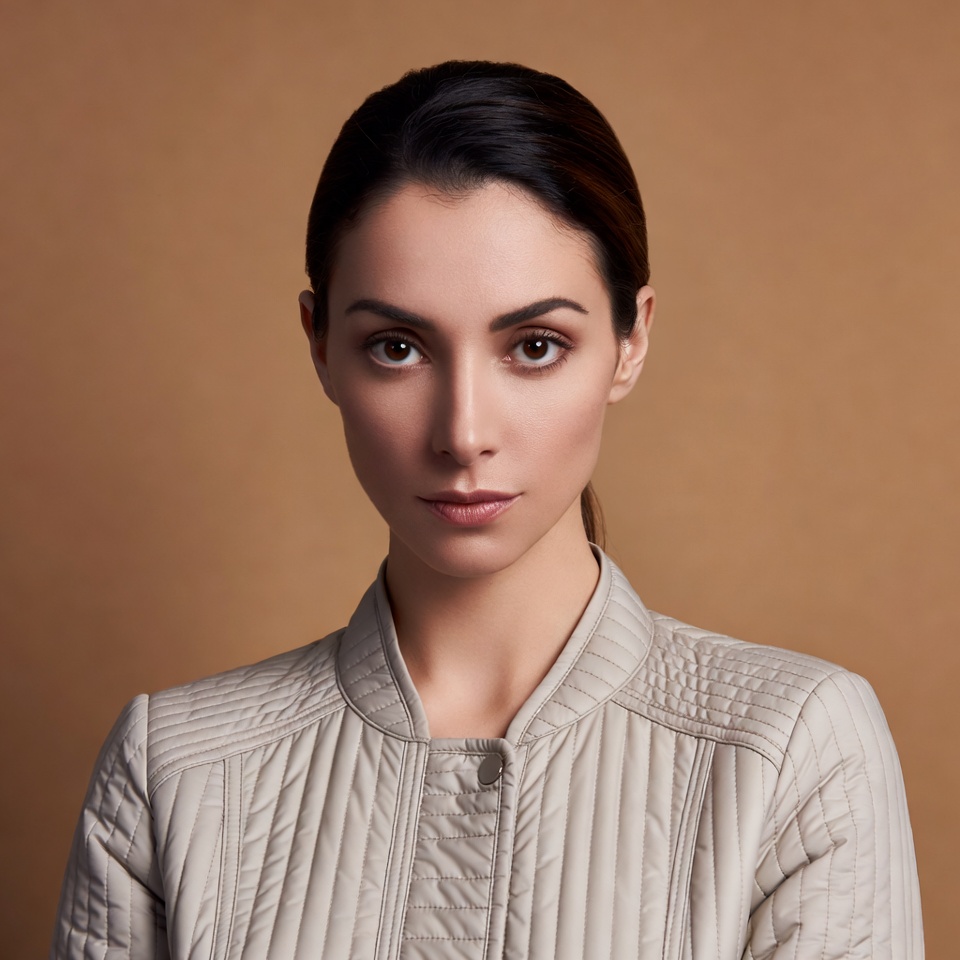 A woman with dark hair in a ponytail poses confidently against a beige background. She wears a light-colored quilted jacket with a collared neckline and subtle stitching details. Her expression is neutral with direct eye contact.