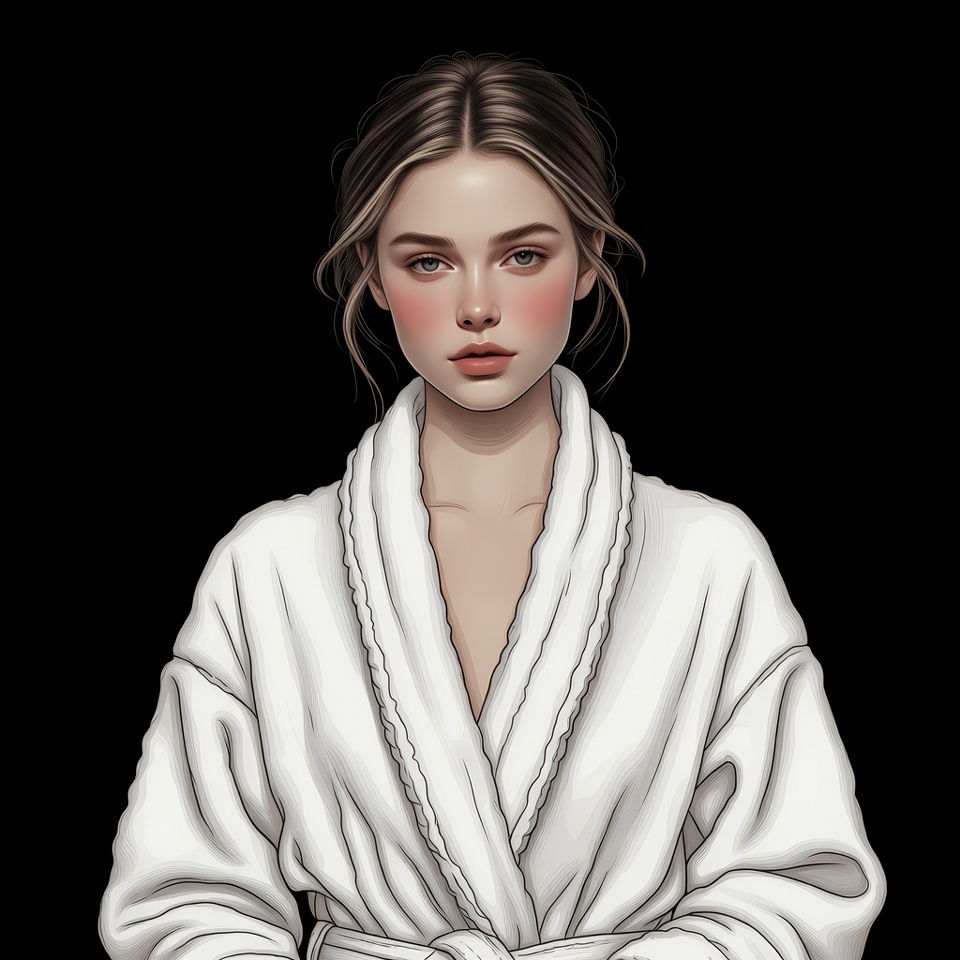 A young woman with light brown hair styled in a loose updo gazes forward against a black background. She wears a fluffy white bathrobe with a deep V-neckline and tied waist. Her makeup features pink blush and subtle lip color, giving her a soft, detailed illustrated appearance.