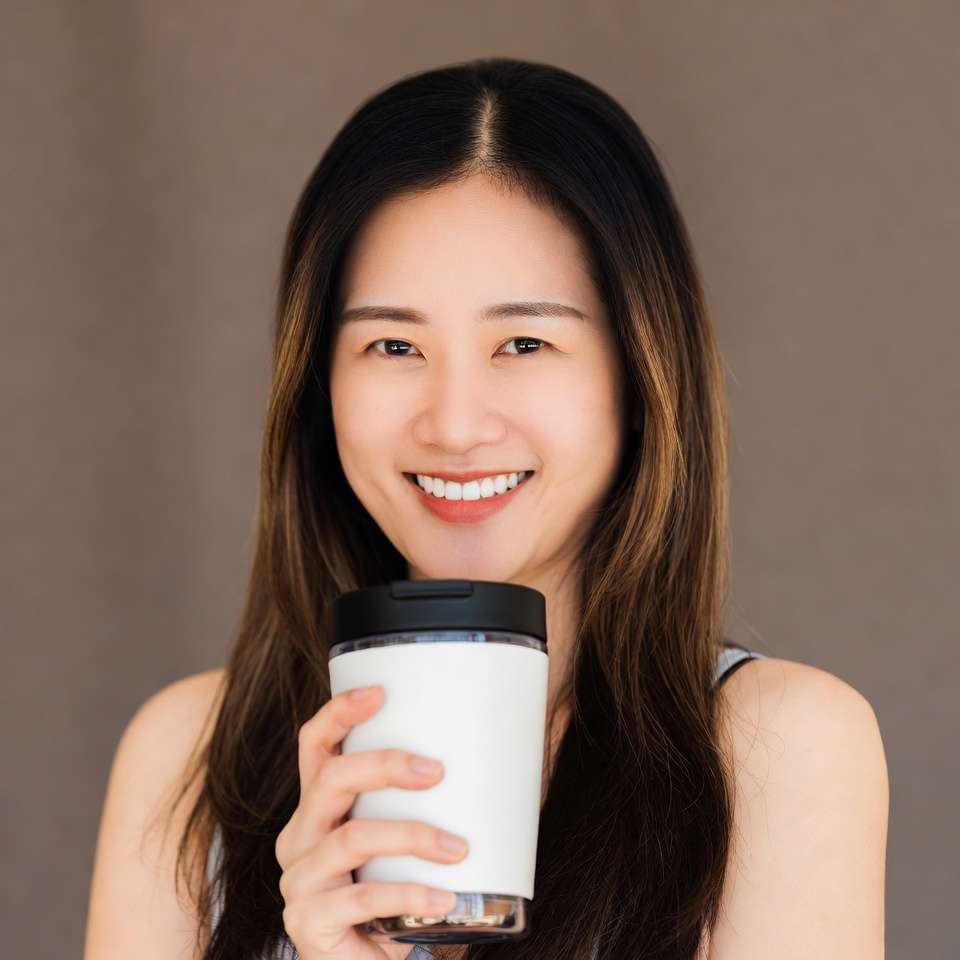 Asian, beige background, beverage cup, black lid, casual clothing, dark hair, female, friendly expression, happy face, headshot, holding cup, insulated mug, long hair, portrait, smiling, straight hair, tank top, white tumbler, young woman, woman