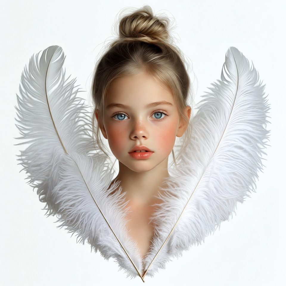 A young girl with blonde hair in a bun and striking blue eyes gazes forward. She has rosy cheeks and pink lips, framed by large white feathers forming angel wings around her face and shoulders. The image features a clean white background.