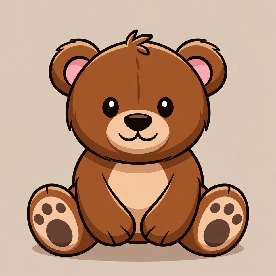 A cute brown teddy bear with big sparkling eyes sits on a plain background in a colorful cartoon illustration. The bear has fluffy fur, pink inner ears, and paws with dark pads. It smiles happily with its mouth slightly open.