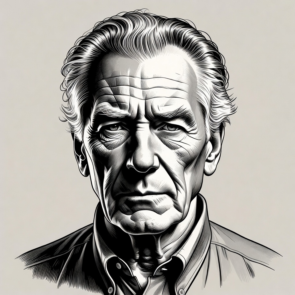 A detailed black and white illustration of an elderly man with wavy white hair and intense eyes stares directly at the viewer. He has deep wrinkles on his forehead and face, and wears a collared shirt with a serious expression. The portrait is rendered in a realistic graphic style on a plain background.