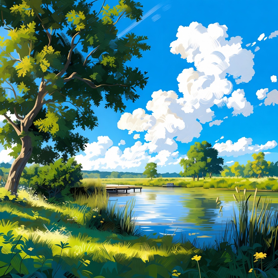 blue sky, calm water, cloudy sky, digital art, dock, green grass, greenery, illustration, landscape, lush foliage, nature, outdoors, pond, reeds, riverside, scenery, serene, summer, trees, vibrant colors, water, white clouds, wooden pier, yellow flowers, lake