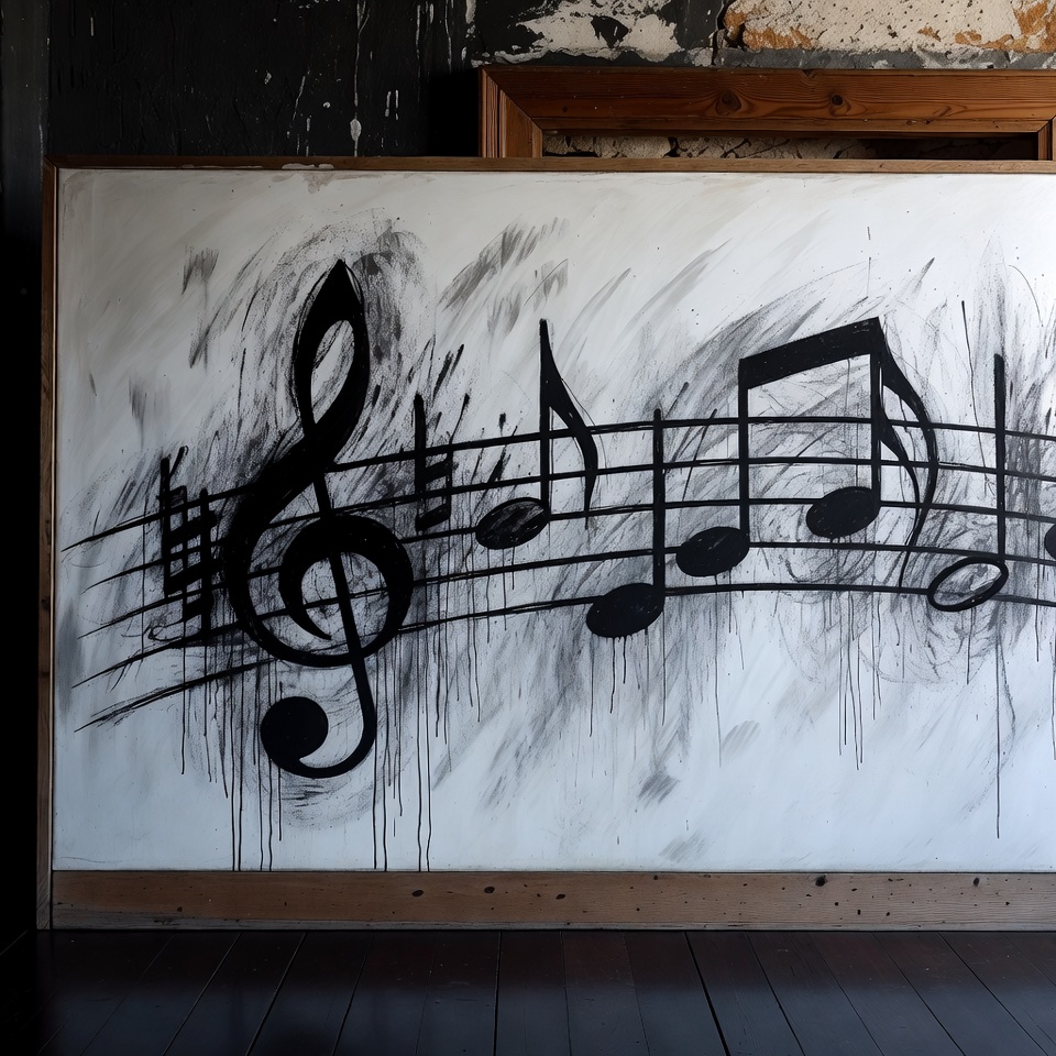 abstract art, art gallery, black white, canvas, dark wall, dripping paint, exposed brick, graffiti style, isolated background, music symbols, painting, peeling plaster, staff lines, treble clef, wooden frame, music notes