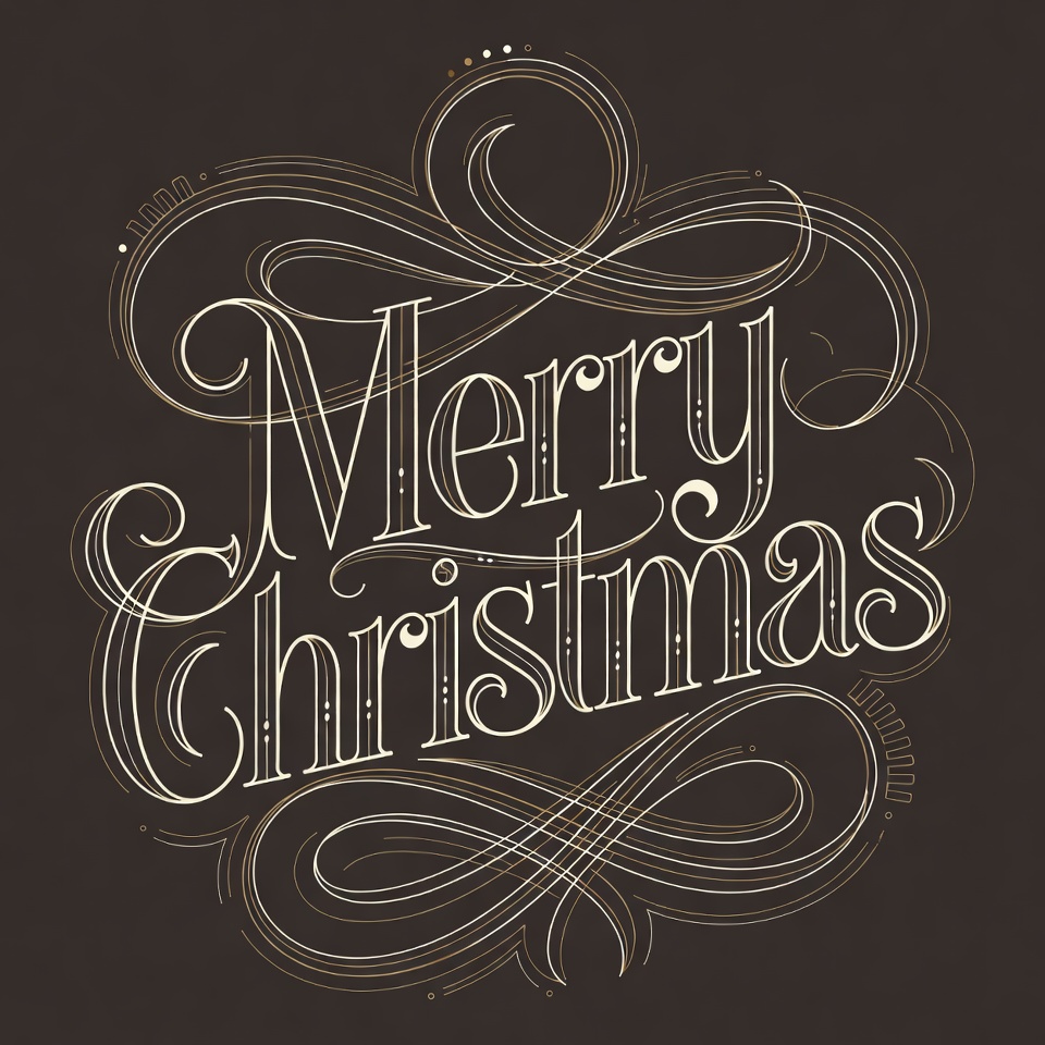 Christmas, Christmas card, clipart, cursive text, dark background, elegant script, festive text, gold lines, holiday greeting, illustration, line art, ornate flourishes, swirling designs, typography, vector art, Merry Christmas