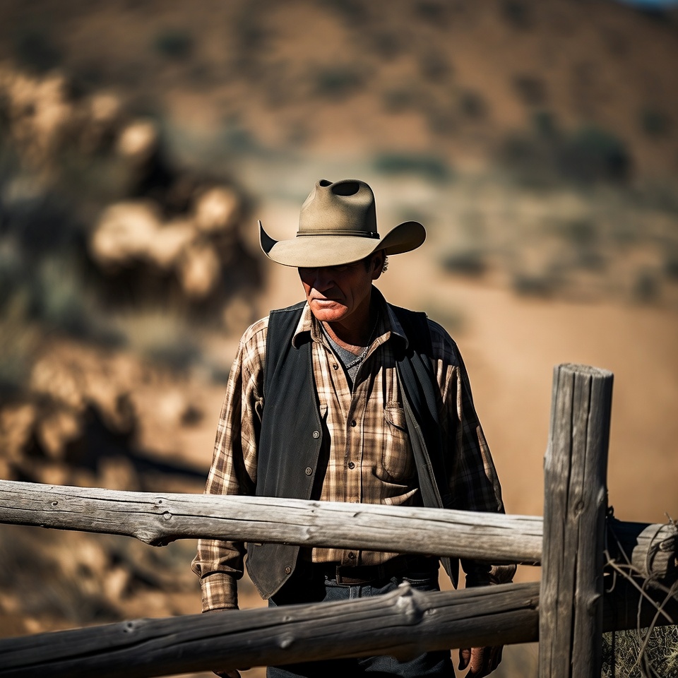 A middle-aged White man wearing a beige cowboy hat, plaid shirt, and black vest stands in a desert landscape. He leans forward with both hands on a rustic wooden fence, gazing into the distance. The background features rocky hills and sparse vegetation under warm sunlight.
