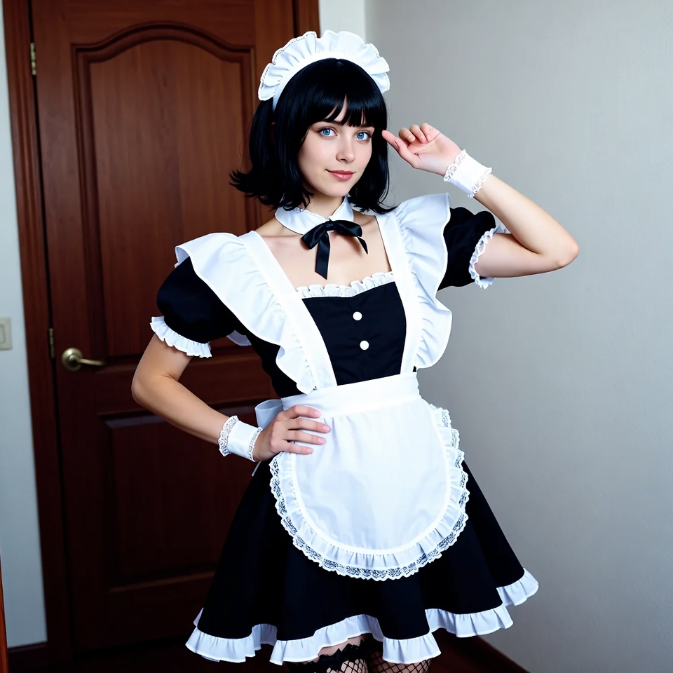 A young woman with short black bob hair and blue eyes wears a classic black and white maid costume with frills, apron, and headband. She poses confidently with hands on hips and a peace sign gesture near a wooden door in a room. She has wristbands and fishnet stockings as part of the outfit.