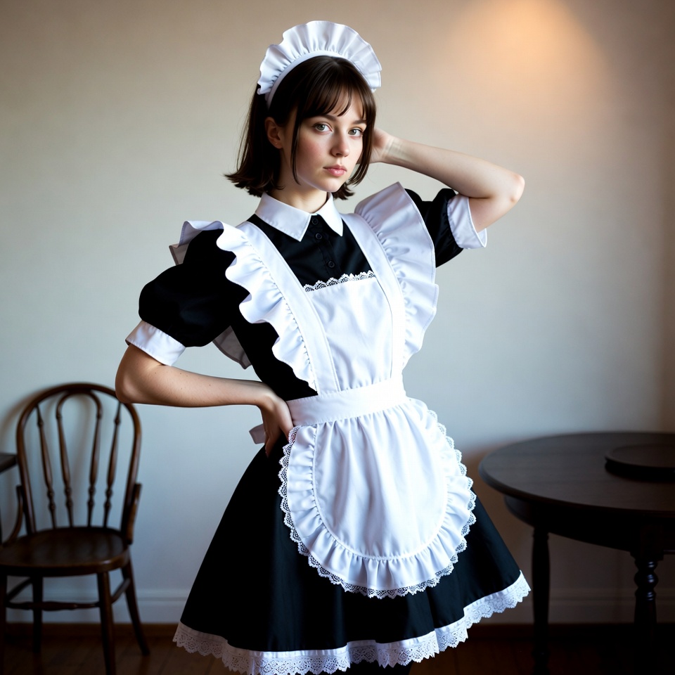 A young woman with short brown hair and bangs wears a classic black and white French maid dress with a frilly white apron, puffed sleeves, and matching headband. She stands in a room with a wooden chair and round table in the background, posing with one hand on her hip and the other raised to her head. The setting features warm lighting and neutral walls.
