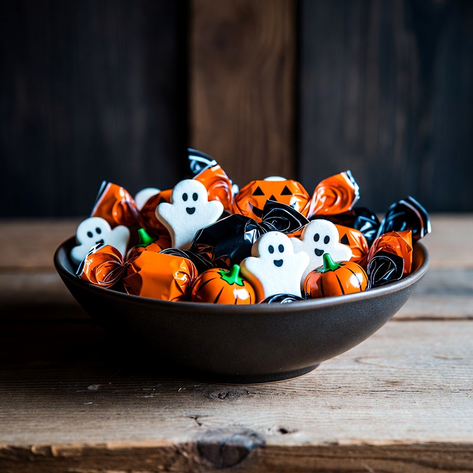 A black bowl filled with Halloween-themed candies shaped like white ghosts and orange pumpkins sits on a wooden surface. The candies are wrapped in colorful foil with black and orange accents. A dark wooden background enhances the festive Halloween display.