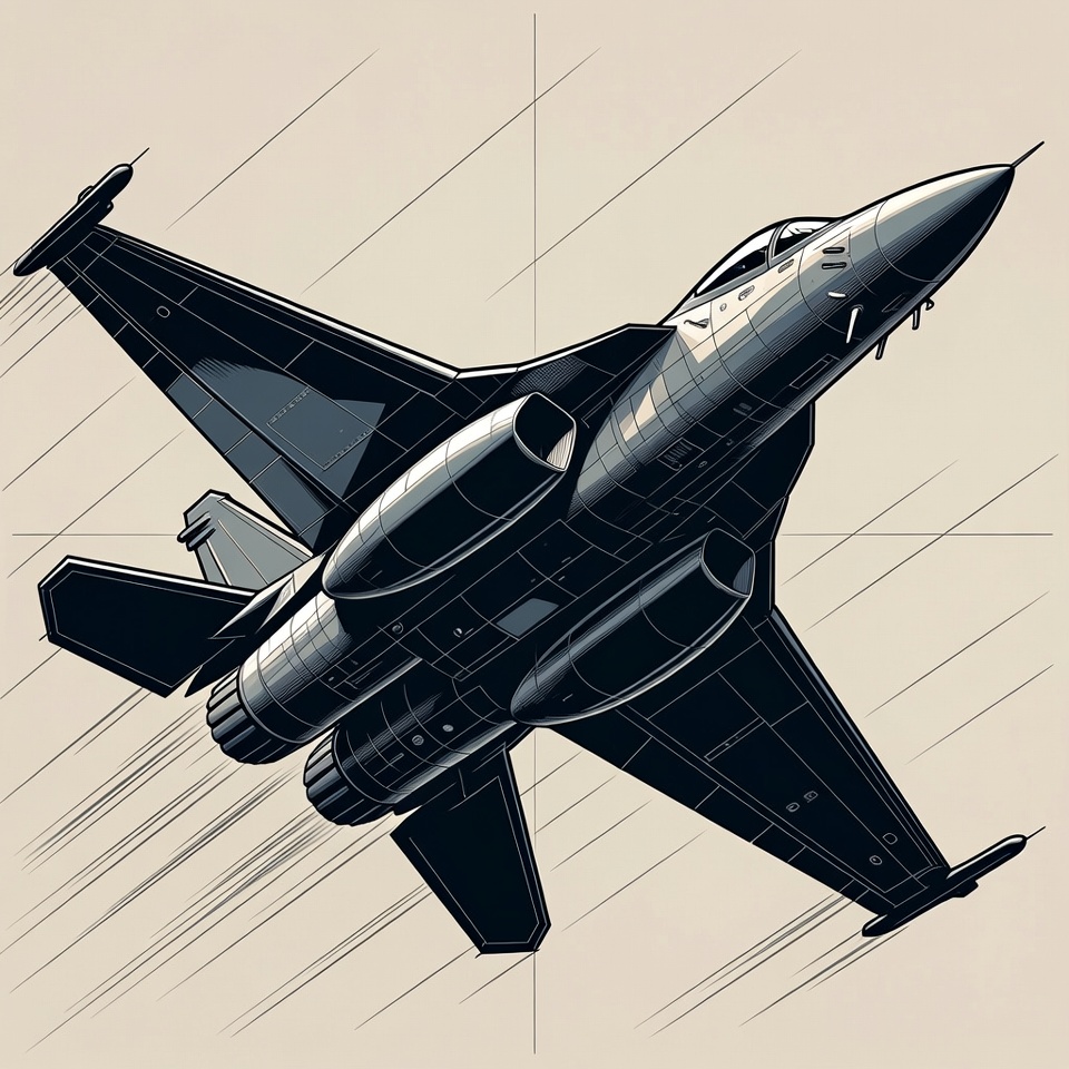 A sleek black fighter jet flies forward in a top-down view on an isolated white background. The aircraft features swept-back wings, twin tail fins, and glowing engine exhausts. Detailed line art shading highlights its aerodynamic design and speed lines.