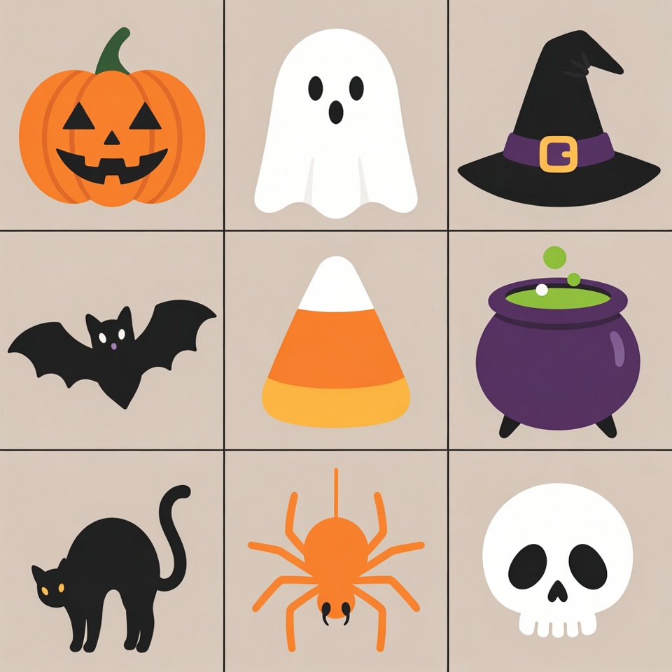 A 3x3 grid features nine colorful Halloween clipart icons on a beige background. The icons include a carved pumpkin, friendly ghost, witch hat, black cat, bat, candy corn, witch cauldron, spider, and skull. Each icon is simply illustrated with bold outlines and vibrant colors.