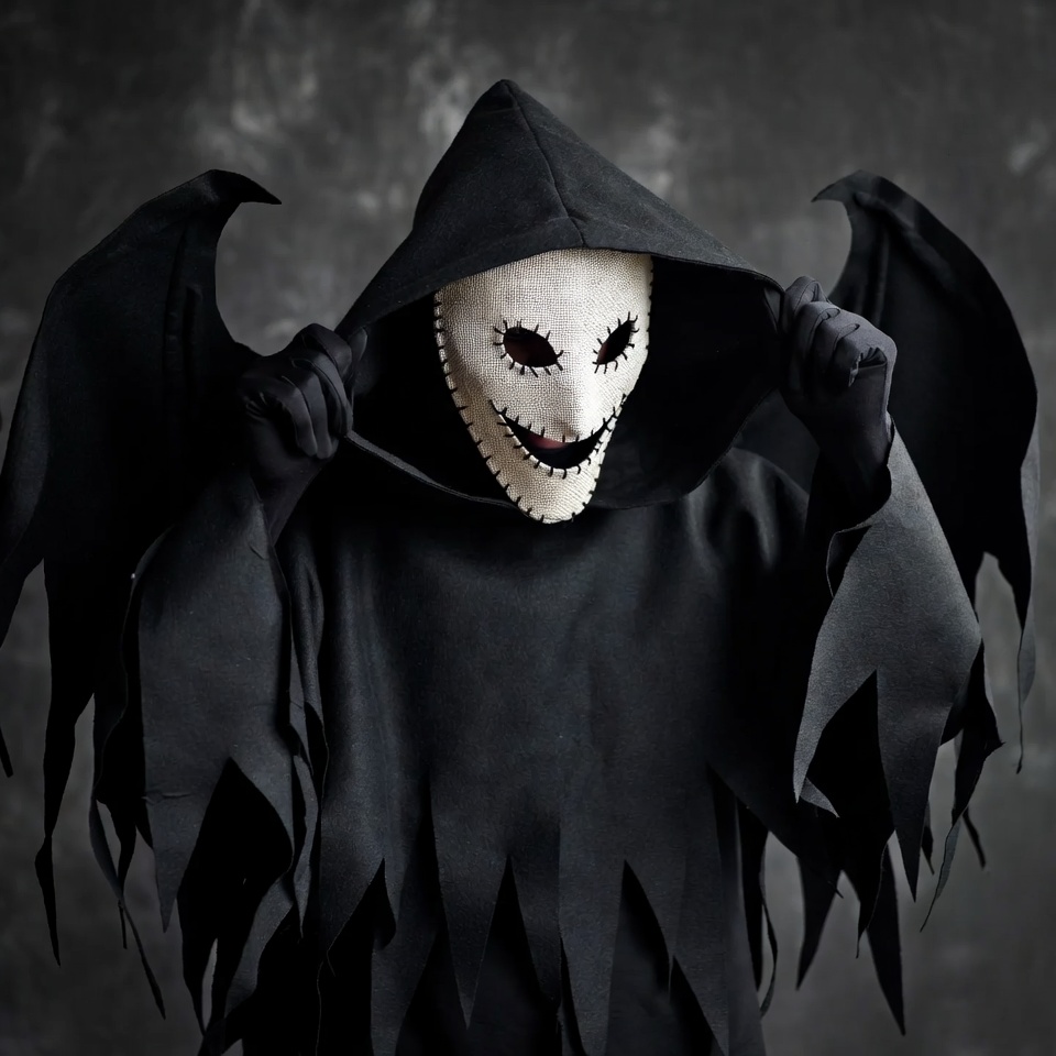 Halloween costume, bat wings, black cloak, cosplay, creepy grin, dark background, gloved hands, hood, hooded figure, horror character, isolated background, male, person, spooky, stitched mask, white mask, wings, ghost mask
