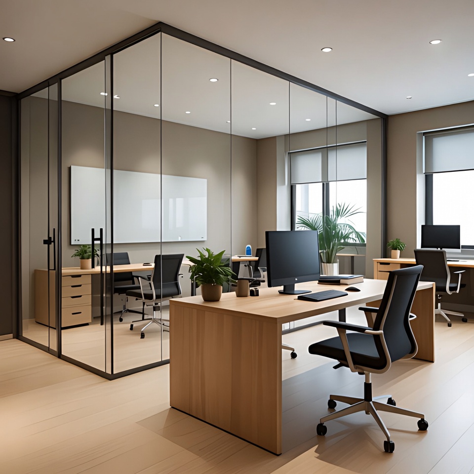 blinds, computer monitors, contemporary design, corporate office, desk drawers, empty office, ergonomic chairs, glass walls, interior design, modern office, neutral colors, office chairs, open plan, potted plants, whiteboard, windows, wood furniture, wooden desk, workspace, office
