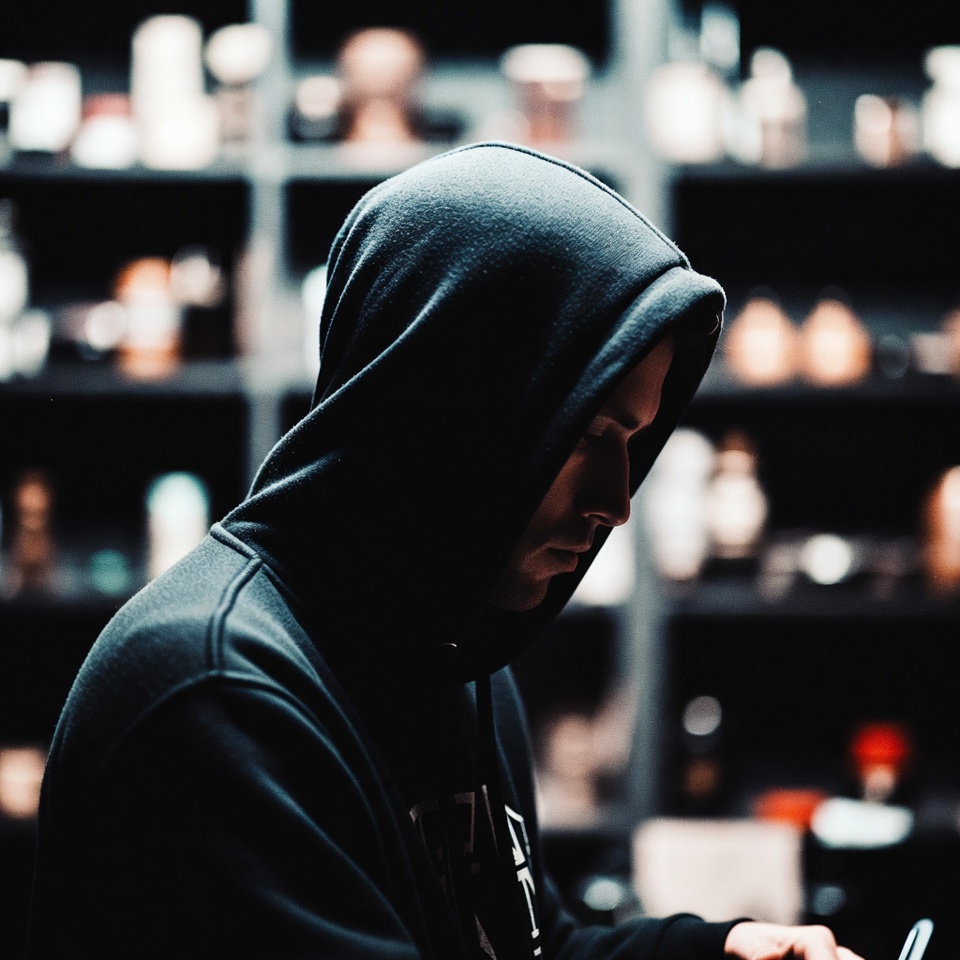 White, black hoodie, blurred background, bottles, dark room, dim lighting, focused, hands, hood up, hoodie, jars, male, man, mysterious, phone, profile view, shelves, smartphone, using phone, young man, hooded man