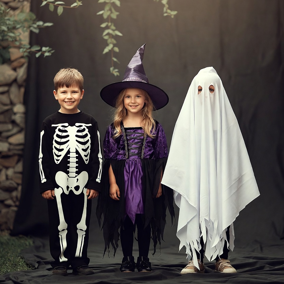 Three young children stand together wearing Halloween costumes on a dark background with rocks and vines. A boy is dressed as a skeleton in black bones outfit, a girl as a witch in purple dress and wide hat, and another child as a ghost in white sheet with cutout eyes. They pose happily with smiles.