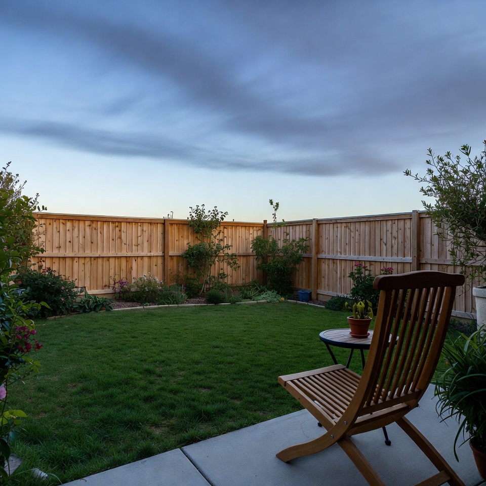 A wooden Adirondack chair sits on a concrete patio in a lush green backyard surrounded by wooden fences. Potted plants and garden shrubs frame the scene under a cloudy twilight sky. The chair faces an open grassy area with colorful flowers nearby.