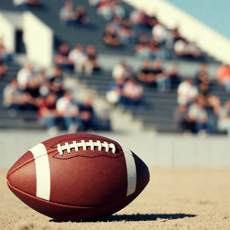 A brown leather football sits on sandy turf in the foreground. Blurred stadium bleachers filled with spectators in the background under a clear sky. The crowd appears to be watching a game.