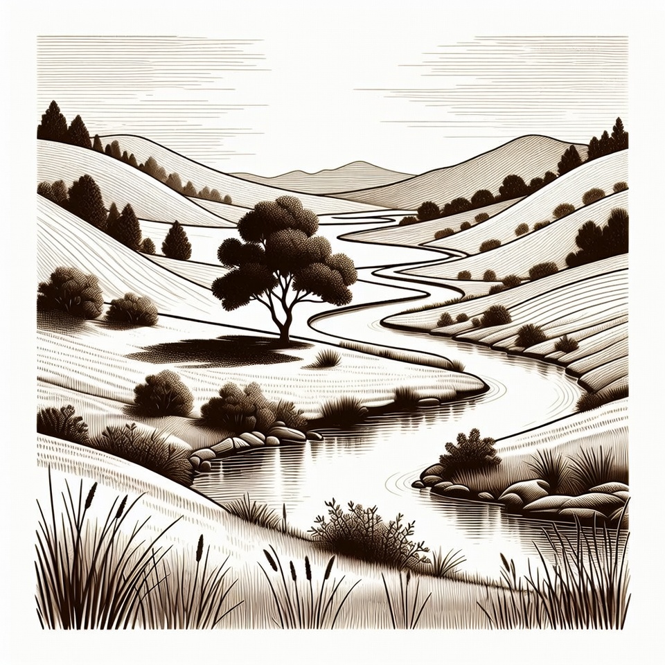 A detailed line art illustration depicts a serene valley landscape with rolling hills and scattered trees. A winding river flows through the center, flanked by bushes, reeds, and rocks. Snow-capped mountains rise in the distant background under a cloudy sky.