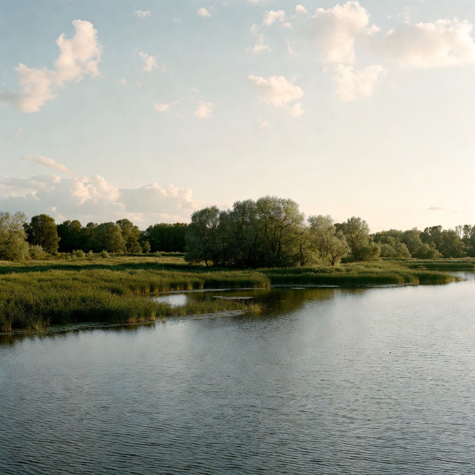 A serene lake reflects surrounding green reeds and trees under a partly cloudy sky. Willow trees line the water's edge amid grassy meadows. The scene captures a peaceful natural landscape at dusk.