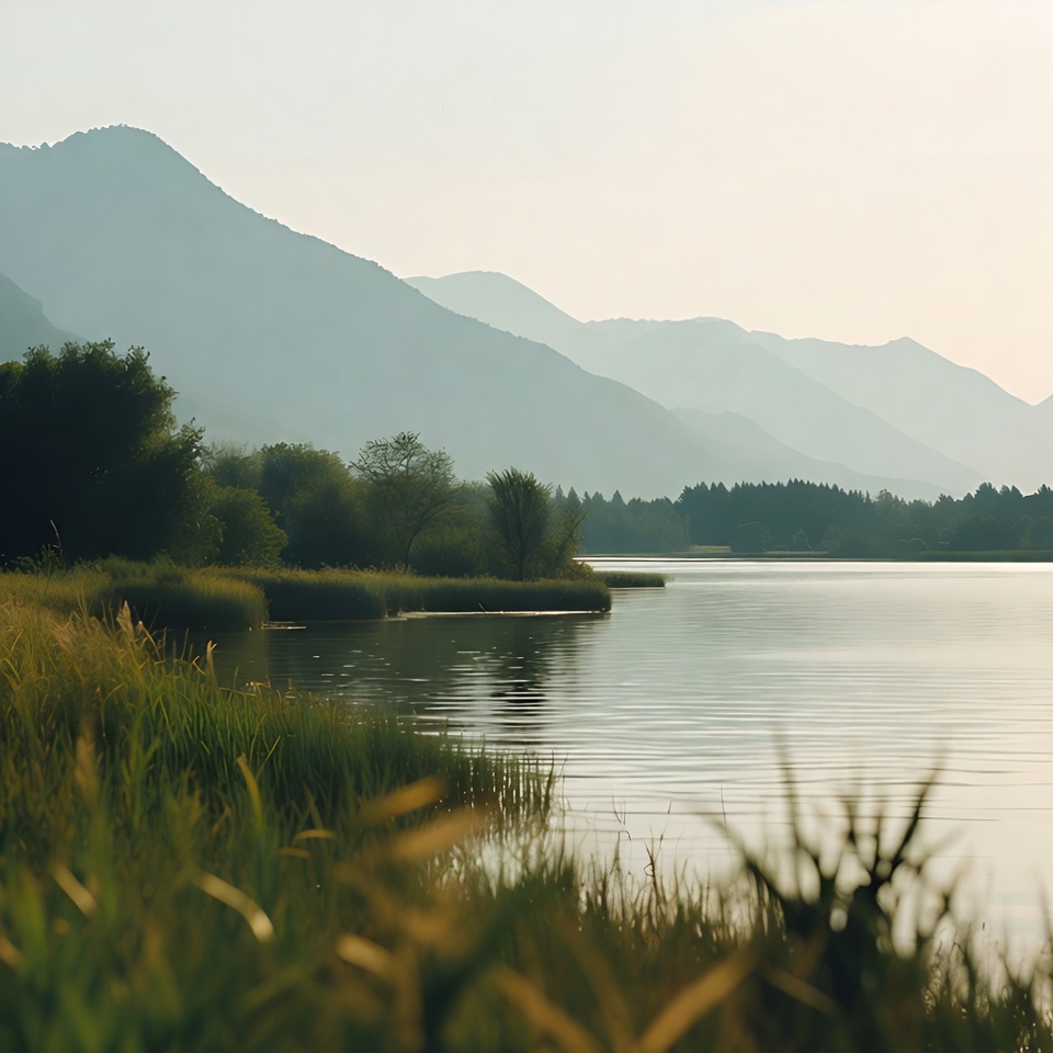 A serene lake reflects layered misty mountains in the background. Tall green reeds and grasses frame the foreground, with trees lining the water's edge. The scene is bathed in soft, hazy morning light.