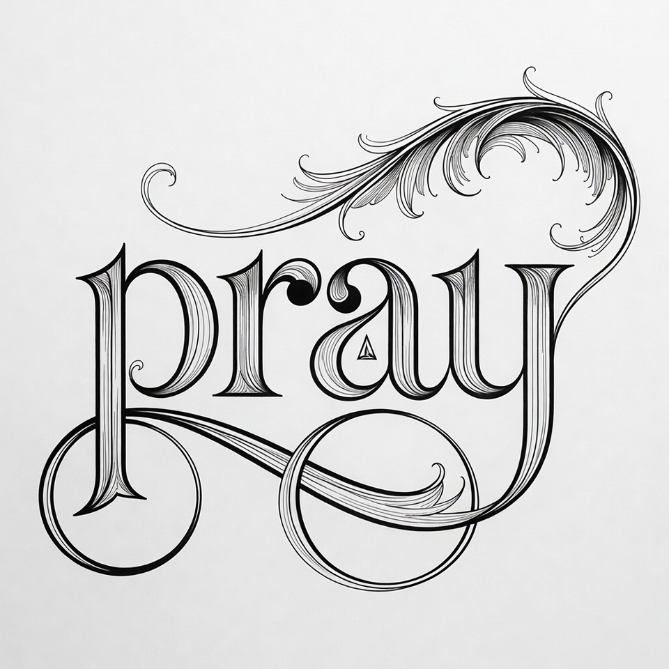 artistic word, black ink, calligraphy, clipart, decorative letters, fancy lettering, flourishes, graphic art, illustration, inspirational design, isolated background, ornate typography, prayer, religious text, script font, swirls, vines, pray