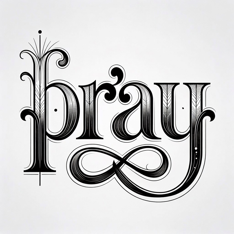 artistic lettering, black ink, bold letters, calligraphy, decorative letters, elegant font, fancy text, flourishes, graphic art, infinity symbol, intricate design, isolated background, motivational word, ornate, script design, swirls, text art, typography, vector style, pray