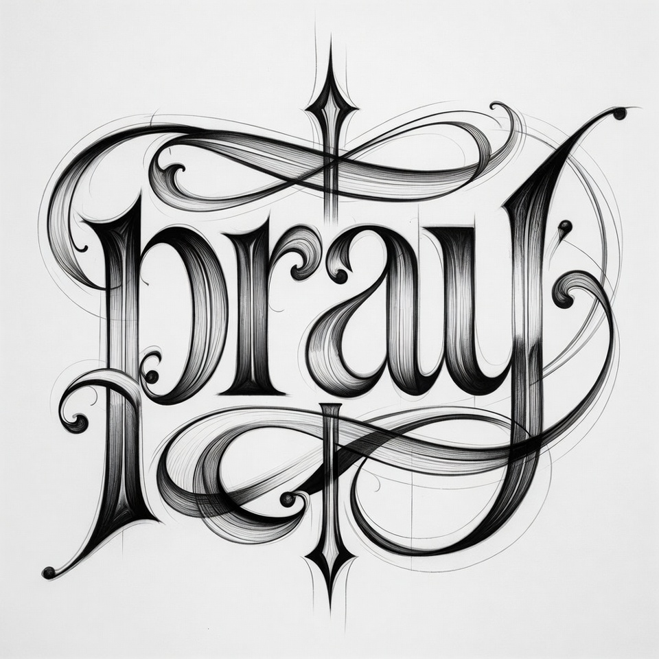artistic text, black ink, bold letters, calligraphy, cross, decorative typography, elegant script, faith symbol, flourished letters, gothic font, graphic art, handwritten style, illustration, ink art, monochrome design, ornate design, prayer word, religious text, script lettering, spiked cross, tattoo style, typography, vector art, vintage font, white background, pray
