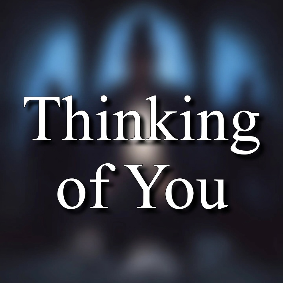 A graphic features the bold white text 'Thinking of You' centered on a dark blue blurred background. The text has a glowing effect with subtle blue highlights. A faint silhouette appears behind the text.