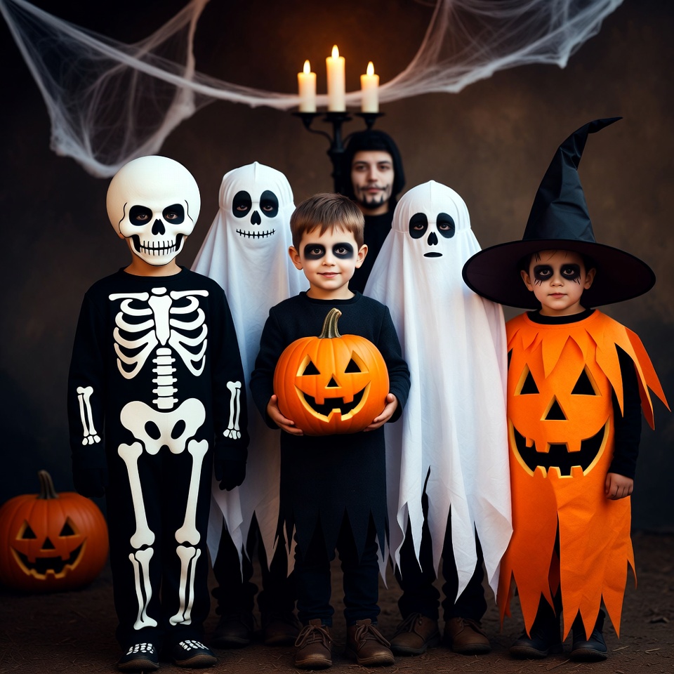 Five children dressed in Halloween costumes stand together against a dark background with cobwebs and candles. They wear skeleton, ghost, witch, and pumpkin outfits, with one boy holding a carved jack-o'-lantern pumpkin. Face paint and masks enhance their spooky appearances.