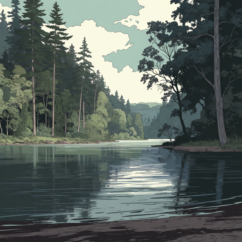 artwork, bank, clouds, coniferous, deciduous, digital art, environment, foliage, green, illustration, landscape, natural, nature, outdoors, peaceful, pine trees, reflection, river, scenery, serene, sky, stream, teal, trees, water, wilderness, woods, forest