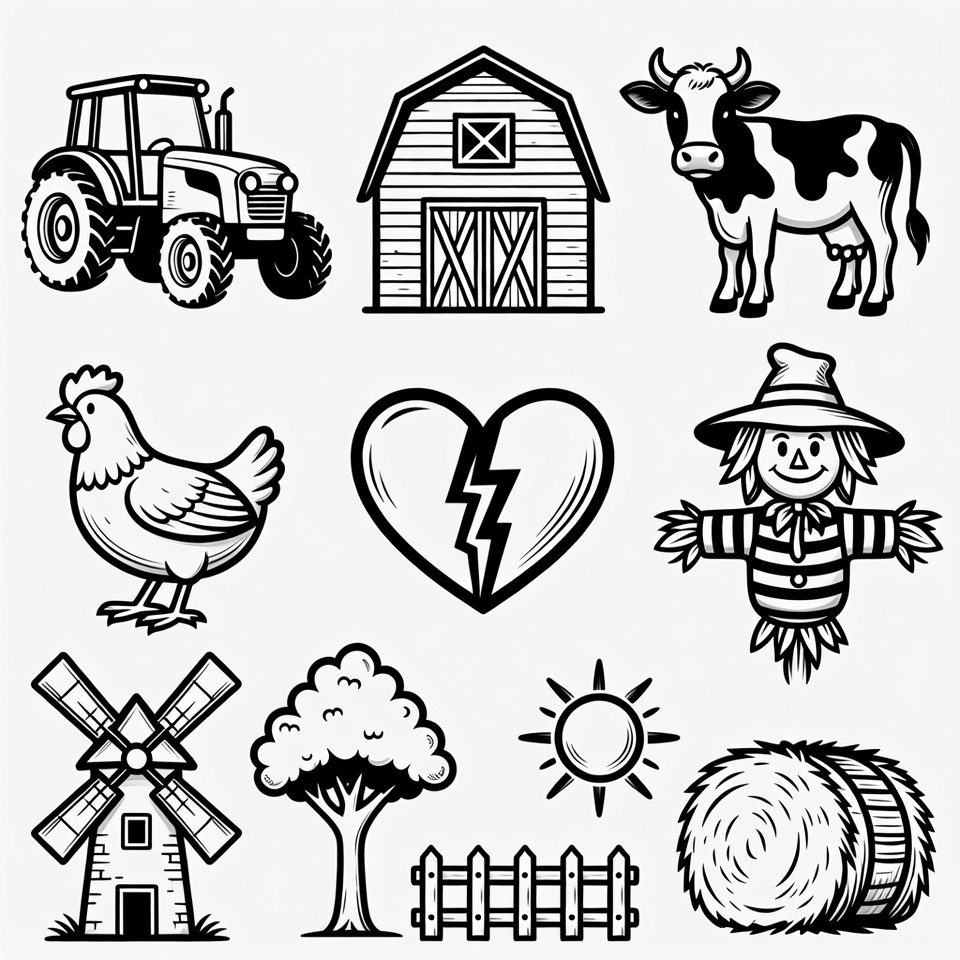 agriculture, barn, black and white, broken heart, chicken, cow, farm animals, fence, harvest, hay bales, illustration, isolated background, line art, livestock, rural, scarecrow, sun, tractor, tree, windmill, farm clipart
