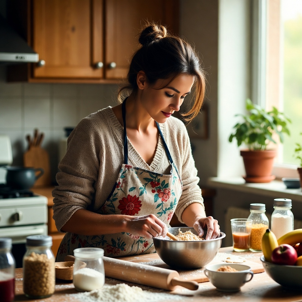 A woman with brunette hair in a bun wears a floral apron over a beige sweater while mixing ingredients in a silver bowl on a wooden kitchen counter. She stands in a cozy kitchen with wooden cabinets, a window with natural light, potted plants, and various baking items like flour, jars, fruits, and a rolling pin nearby. Her focused expression shows concentration on the task.