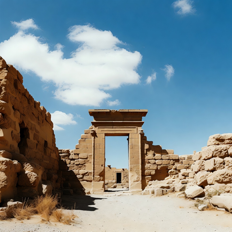 Egypt, Egyptian temple, antiquity, archaeology, architecture, blue sky, clouds, desert, doorway, dry grass, heritage, historical site, monument, pylon, ruins, sandstone, sandy ground, stone gate, stone walls, ancient ruins