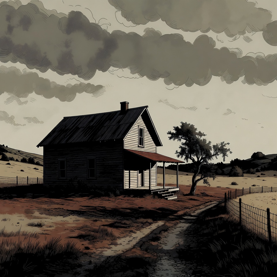 countryside, dirt path, drawing, dry grass, farm house, front porch, gray clouds, hills, illustration, isolated house, rural landscape, rustic house, stormy sky, tree, wire fence, wooden house, old house