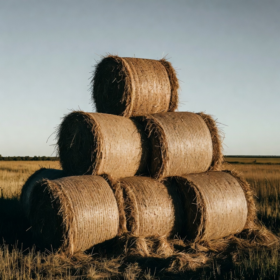 Multiple large round hay bales are stacked in a pyramid formation on a grassy field. The bales are made of golden straw with visible fibers and ropes. The background features an open wheat field under a clear sky.