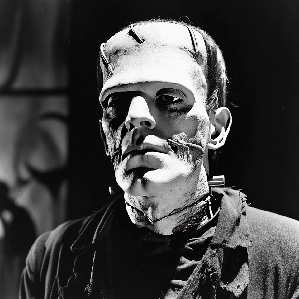 Boris Karloff, Frankenstein, Universal monster, White, black and white, bolts neck, classic horror, closeup, costume, flat hair, horror, makeup, male, monster, pale skin, portrait, scars, stern face, stitches, tattered suit, Frankenstein monster
