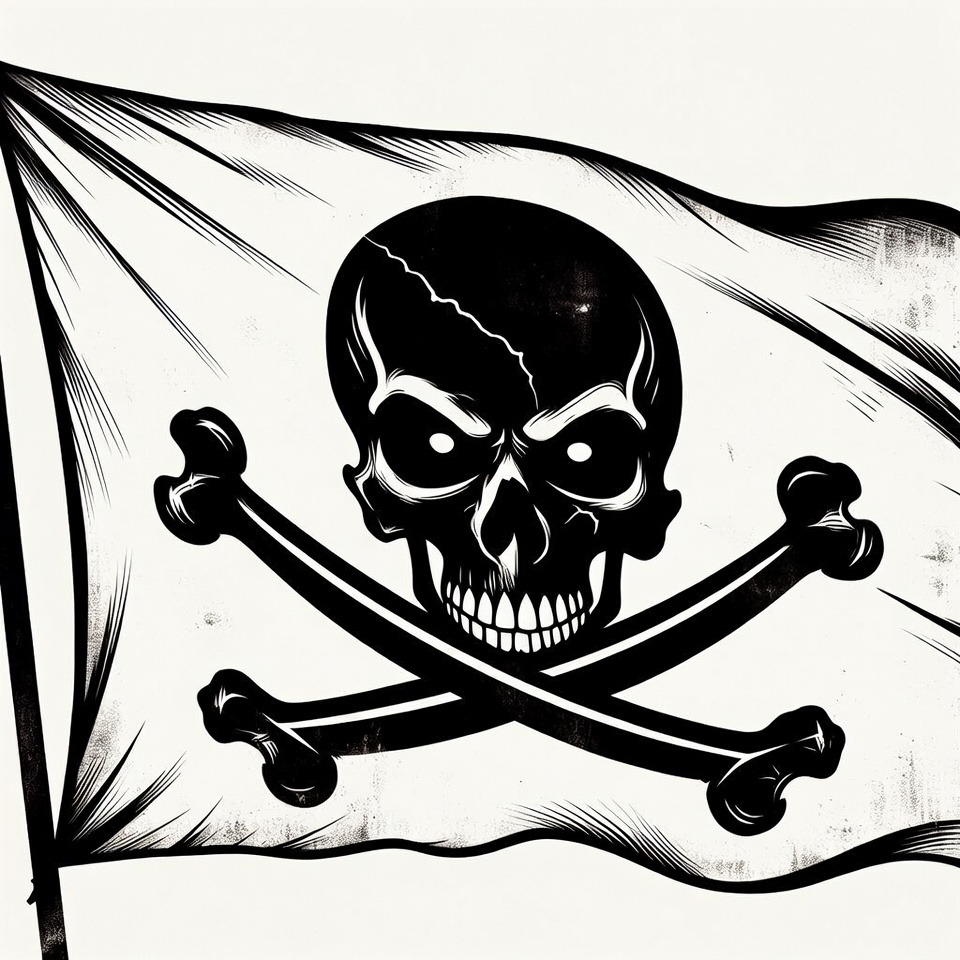 A black skull and crossbones illustration on a white pirate flag waving in the wind. The skull features glaring eyes, grinning teeth, and a cracked top. Bold black line art contrasts sharply against the fabric.