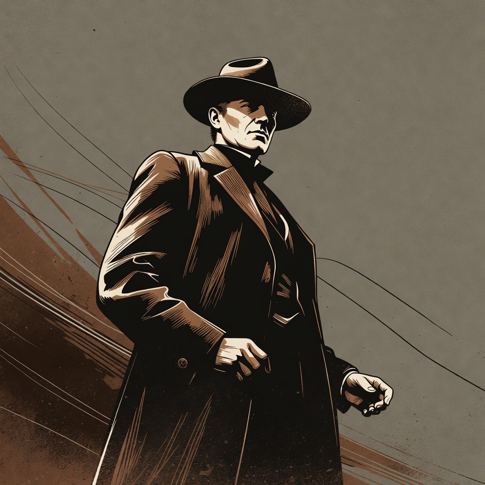 An illustration of a man standing confidently in a wide-brimmed fedora hat and long brown trench coat. He has a serious expression with hands clenched at his sides against a gray background with subtle line accents. The artwork features bold outlines and a noir style.